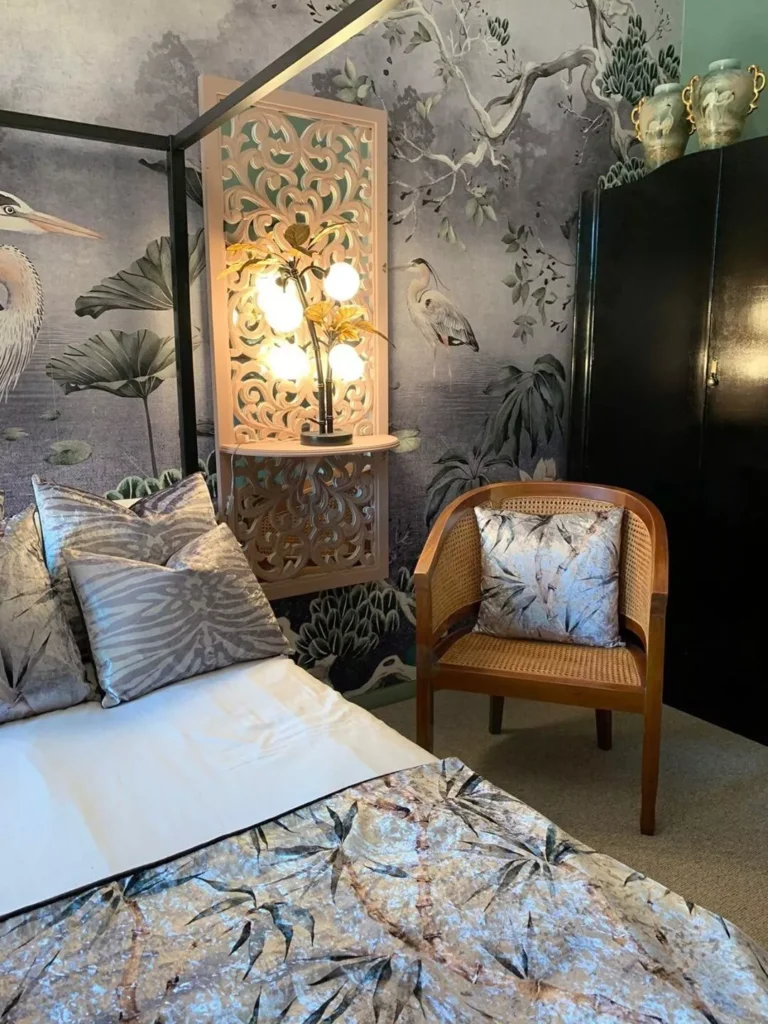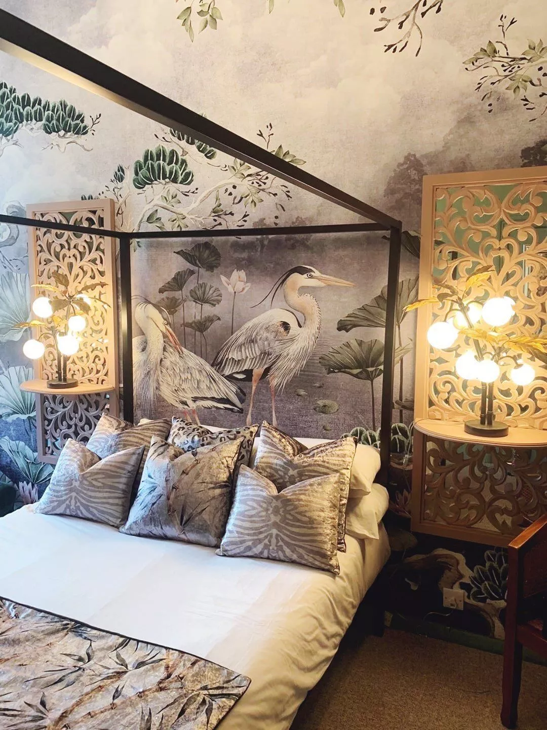 Choosing an Oriental theme with an influence of Japanese Kimonos, Siobhan hoped to create a sense of understated luxury wallpaper in the Wedding Venue bedroom including patterns of herons, foliage and bamboo.