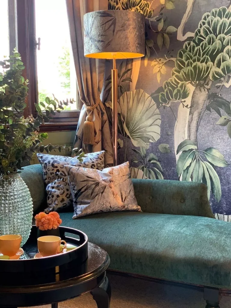 In episode 3, Siobhan displayed the Silver Orient Wall Mural above the bed in the wedding venue location, on the opposing wall she included close-ups of the giant lily pads from the mural design which were framed with a wooden green trim. The hotel bedroom also included a range of other Avalana products including Zebra Mirage Velvet Cushions, Inky Leopard Velvet Cushions & Bamboo Lampshade & Curtains.