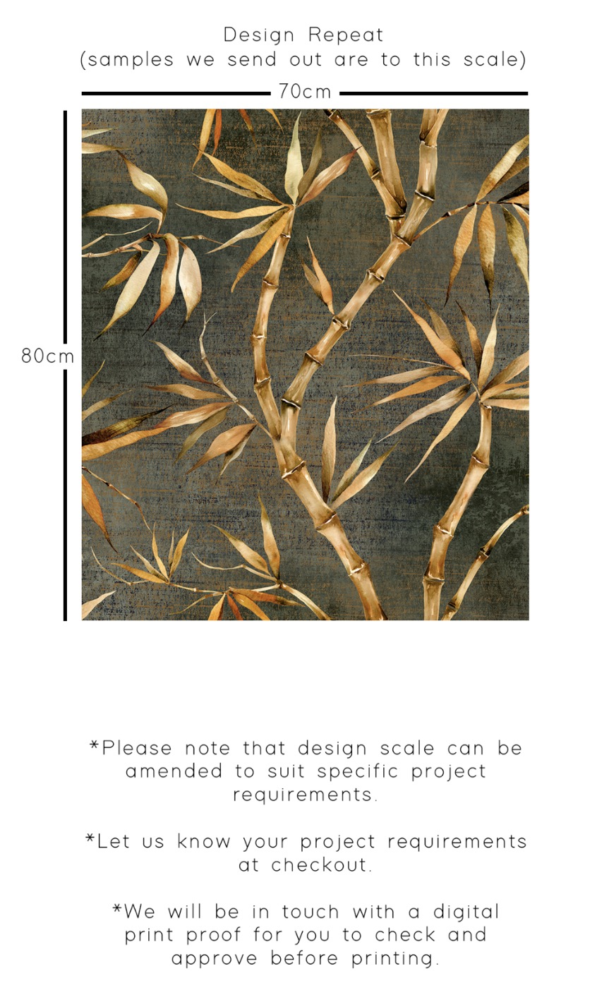 If you are looking to fill your interior with the beauty of nature the Forest Green Bamboo fabric is sure to do just that. Hand painted in natural hues of greens and natural gold from the bamboo stalks, this design has been inspired by the natural bamboo forests of Japan. Set against a silk texture background that incorporates the tones within the bamboo plant.