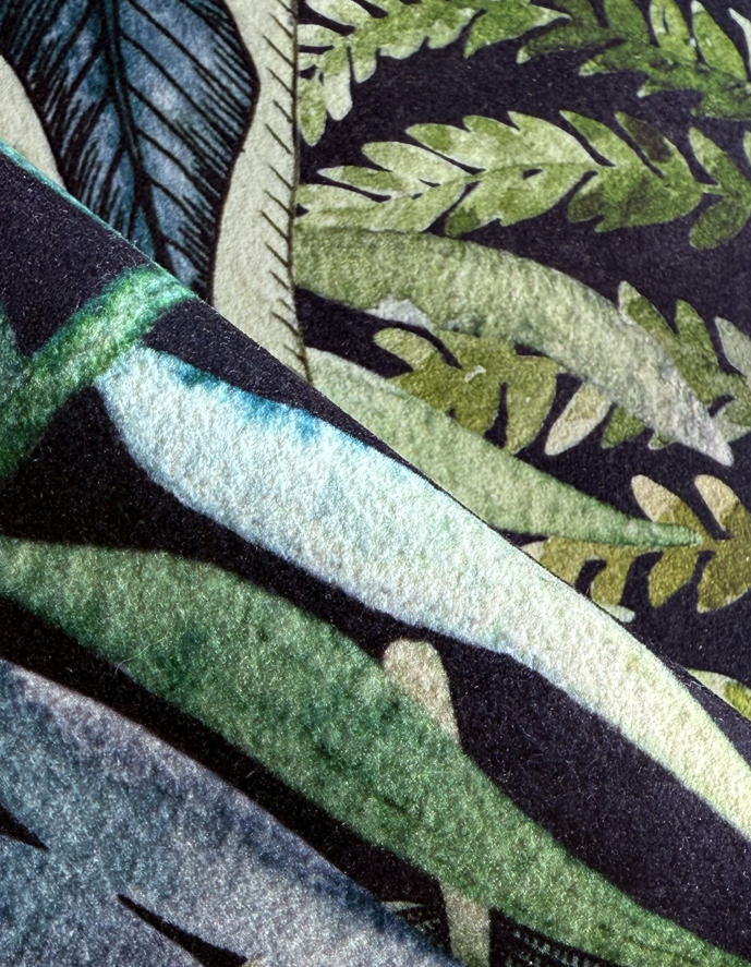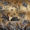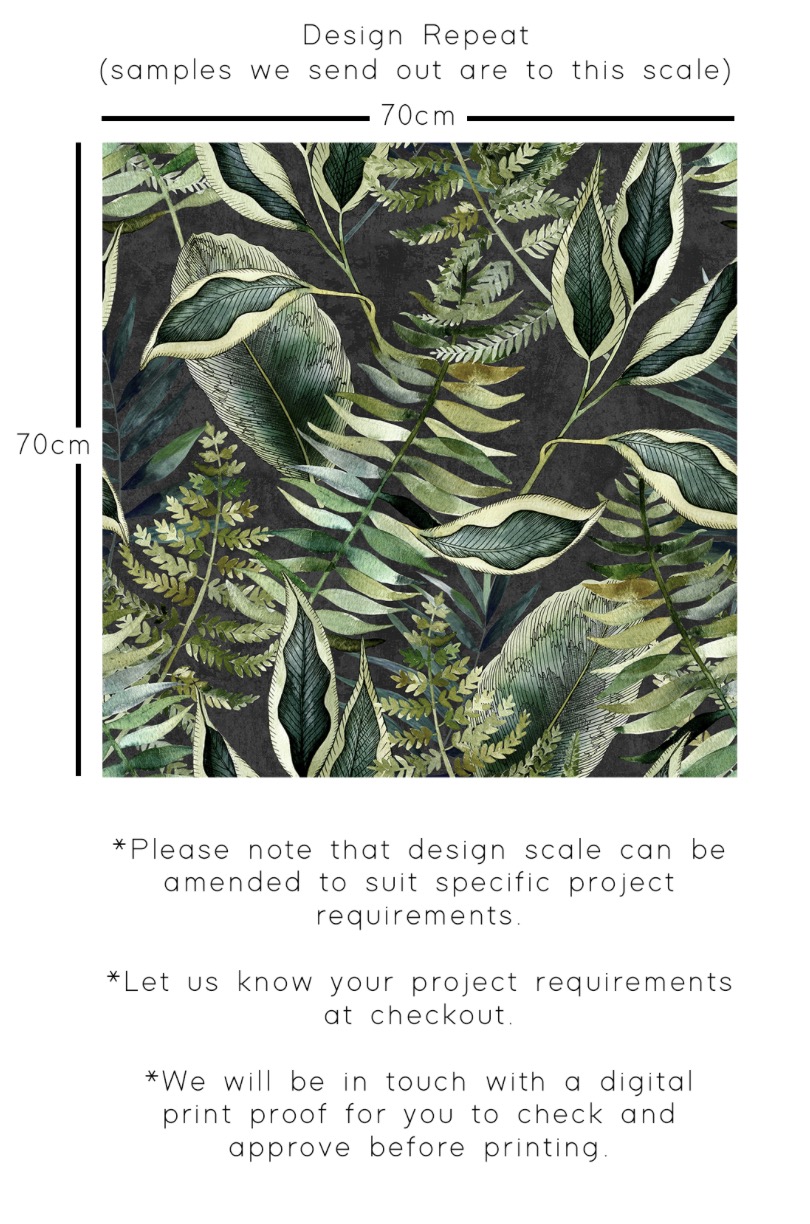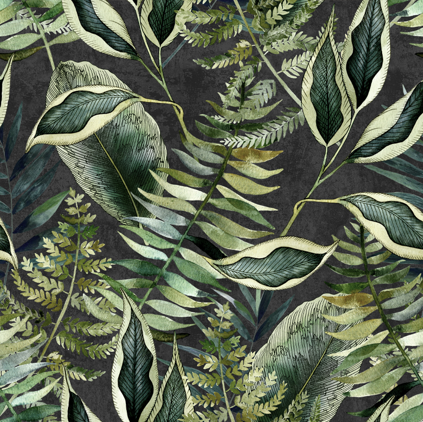 Create a sense of drama within your interior with this hand-painted moody tropical design. The textured dark base against the lush watercolour emeralds & golds convey a moody aesthetic – think moonlit jungle with its tropical foliage being softly enveloped in the shadows of the forest nightscape.