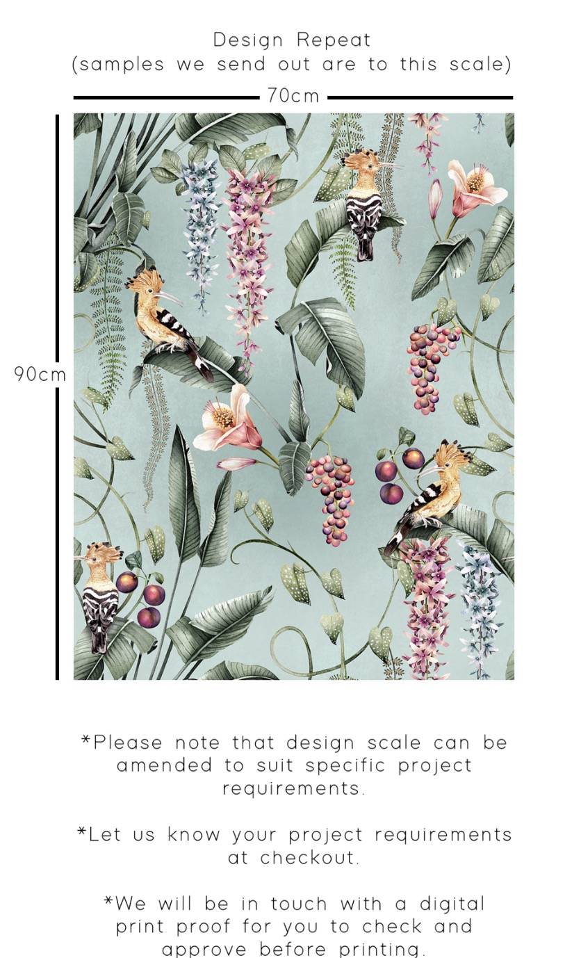 These extraordinary Hoopoe birds are hand-painted in watercolour and ink. The fantastic detail of their distinctive crown of feathers is such a unique and wonderful characteristic of this special bird. Captured sitting amongst the tropical fruit garden as it browses for berries.