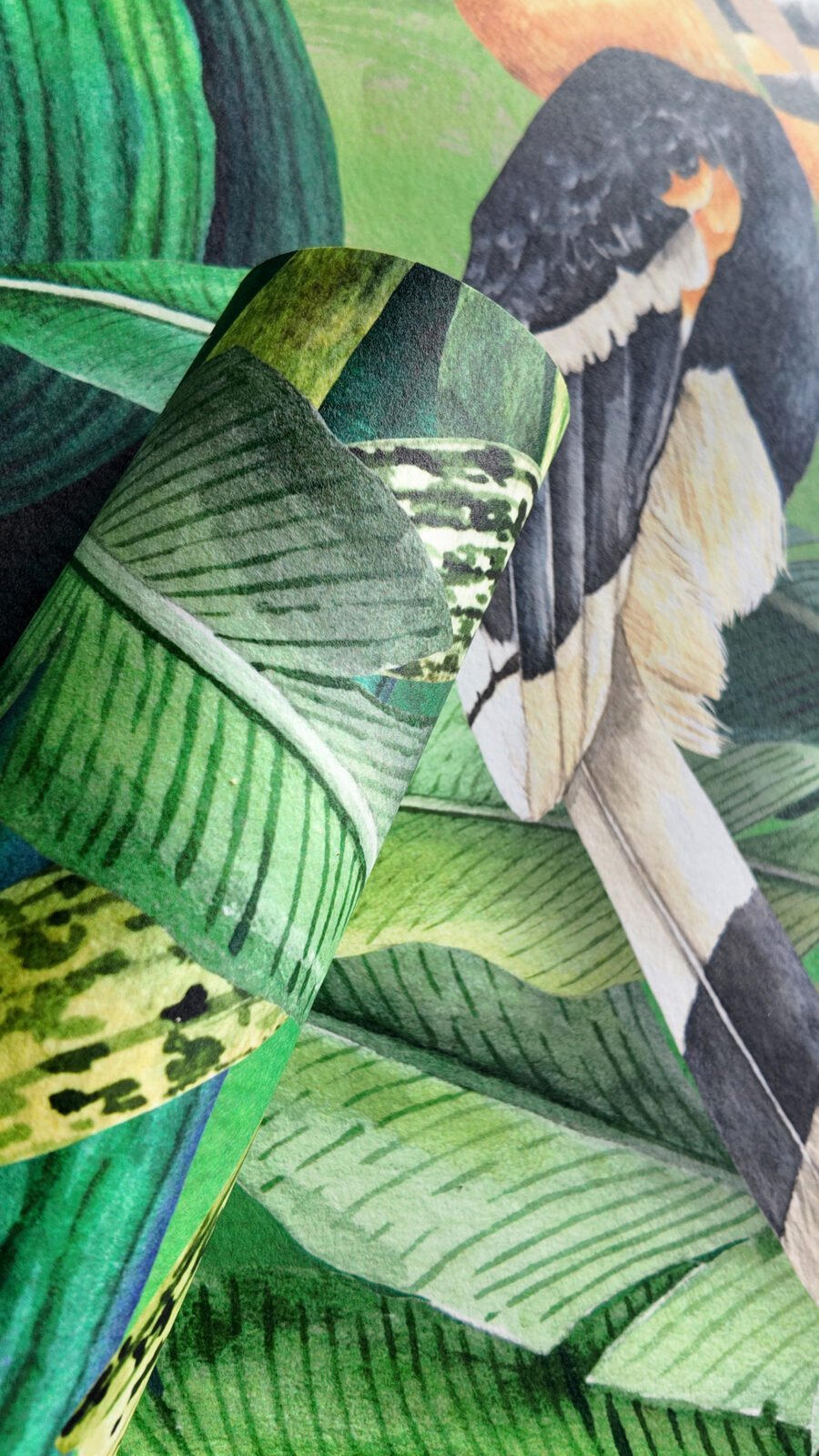 Exotic parrots and sculptural botanicals weave through a richly detailed landscape, where painterly textures and vibrant tonal shifts create a sense of depth, movement and quiet luxury. The composition balances bold colour with refined elegance, echoing the iconic garden’s ability to feel both vibrant and serene, a sanctuary of form, shade and light.