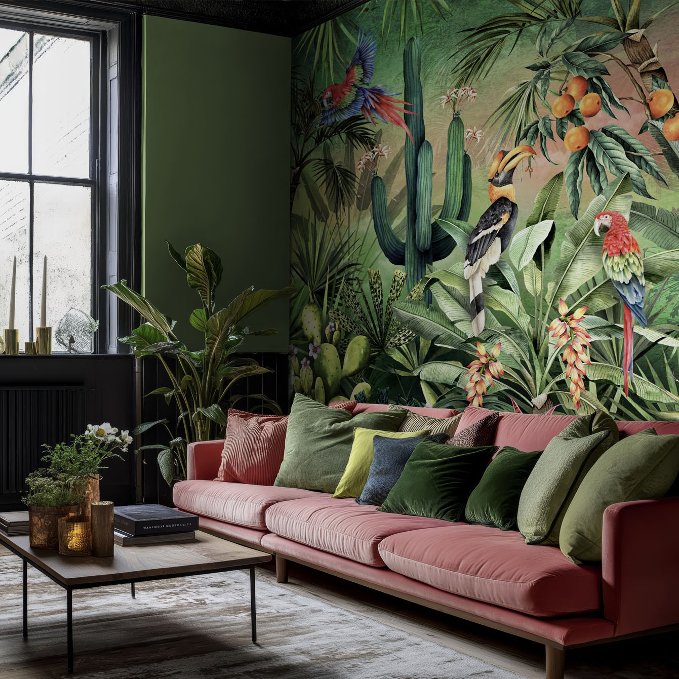 A celebration of sun-drenched escapism and botanical opulence, Majorelle Calypso is an immersive mural inspired by the enchanting serenity of Marrakesh’s Jardine Majorelle. Towering cacti and abundant tropical foliage rise in layered harmony, capturing that moment when lush greenery envelops you entirely, alive with birdsong, warmth and the golden hush of North African sunshine.