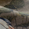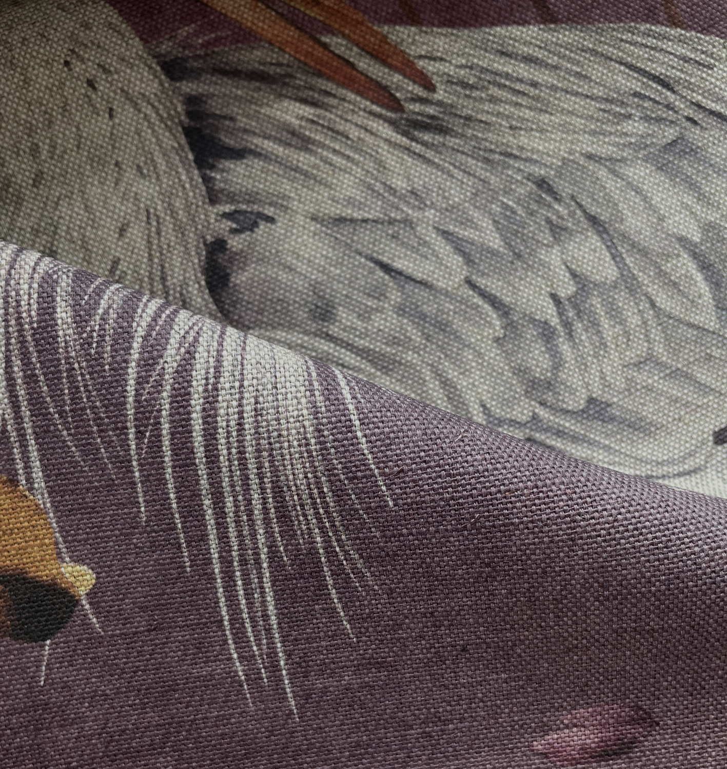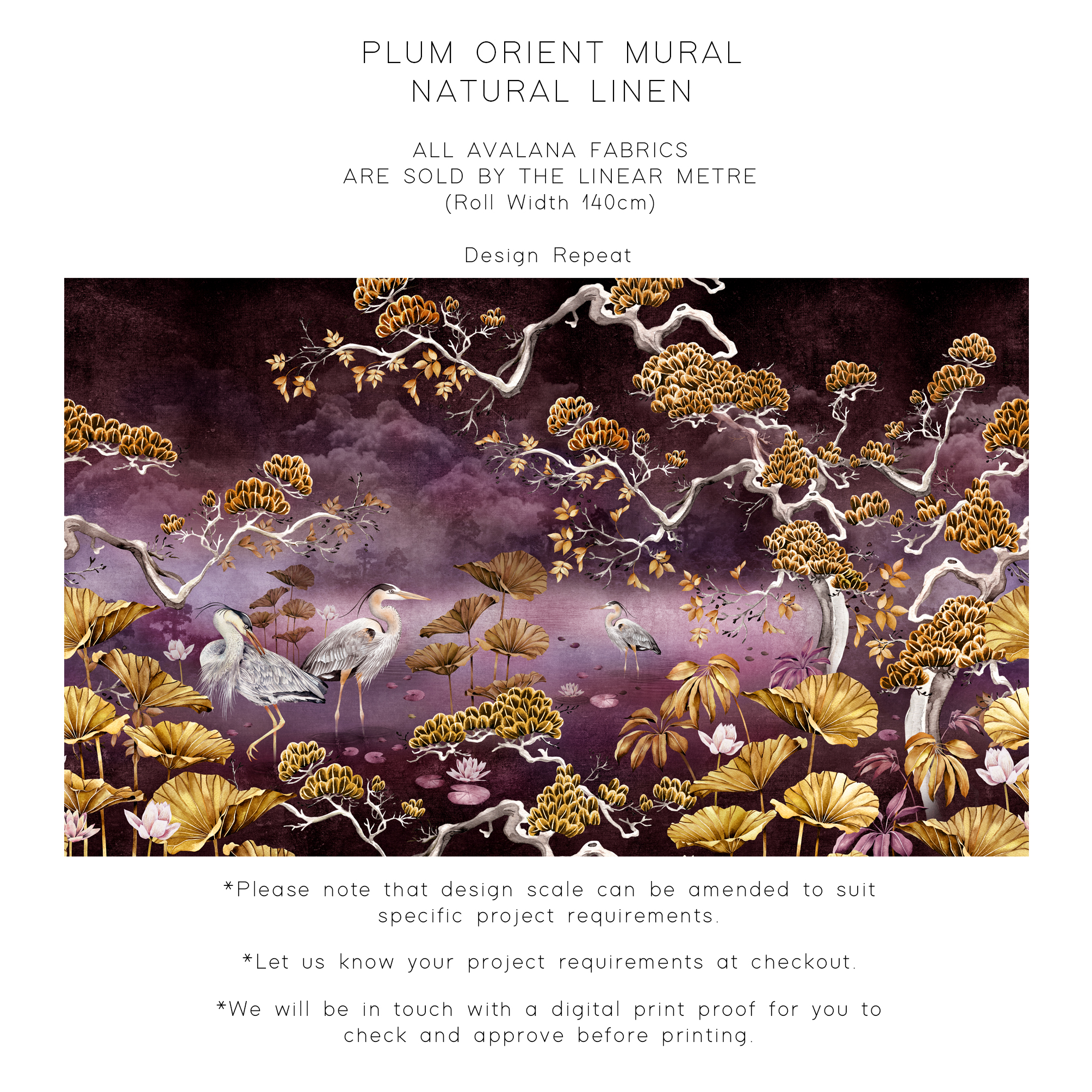 Created using beautifully painted watercolours, the golden foliage glows against the moody plum and fuchsia landscape. The scene depicts Great Blue Herons wading through a moon lit lily pond, surrounded by golden lily pads. This wall mural is utterly divine, the more you look the more detail you see, and will become an instant focal point in your home. Adding glamour and striking beauty to any interior setting.