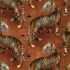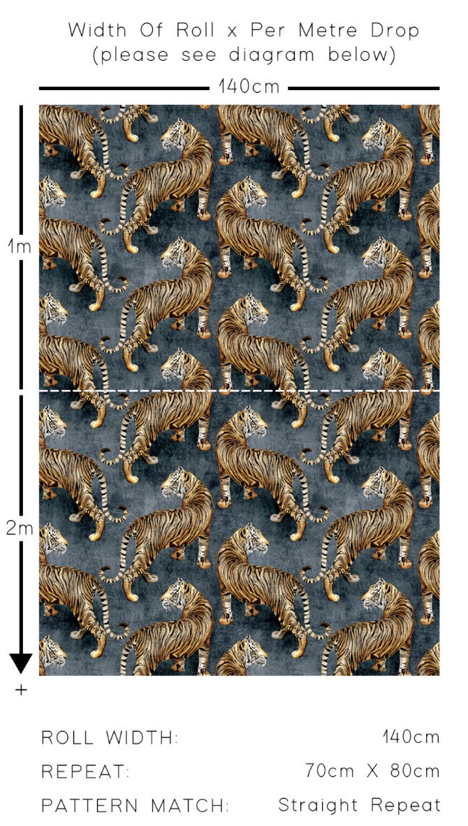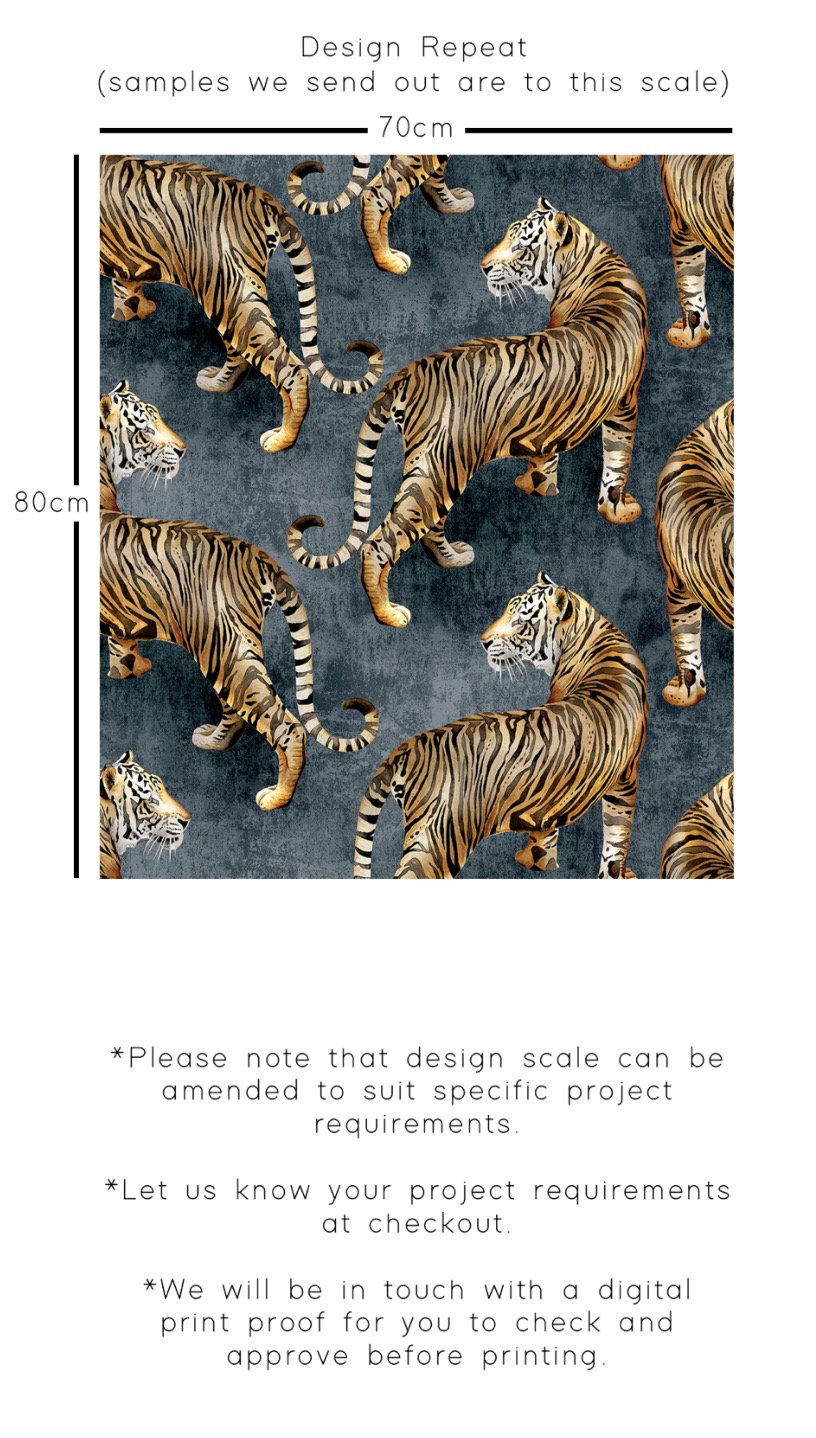 This stunning hand painted tigress fabric is sure to add a unique spin and luxury feel to your interior space. The watercolour textures and depth of colour, with gorgeously deep indigo offset by the copper of the tigress is truly striking. The flowing motif layout creates a harmonious design and a unique take on animal print.